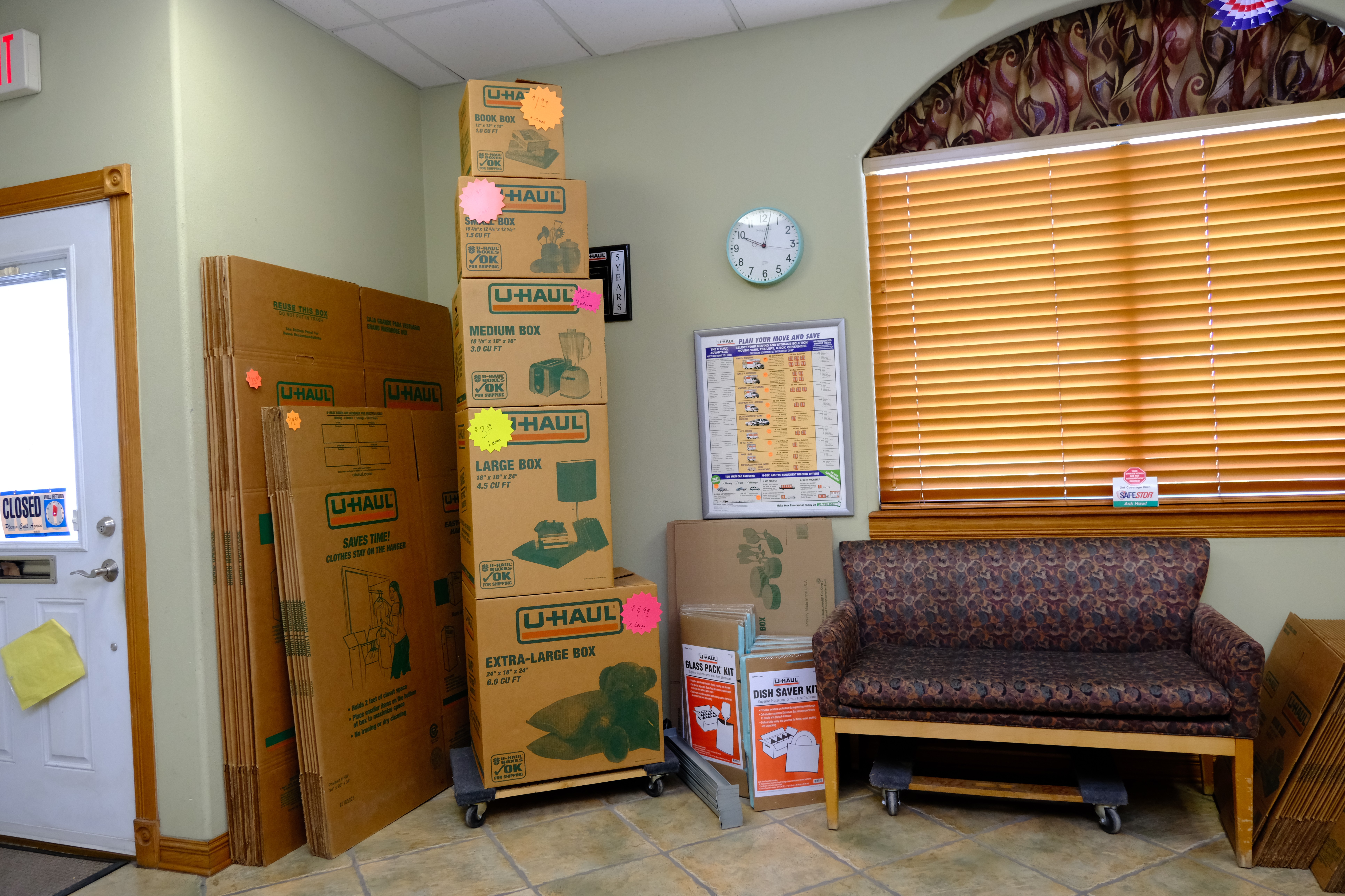 Grab sturdy boxes, tape, bubble wrap, carts and dollies, and specialty covers right at the office—no extra errand required.